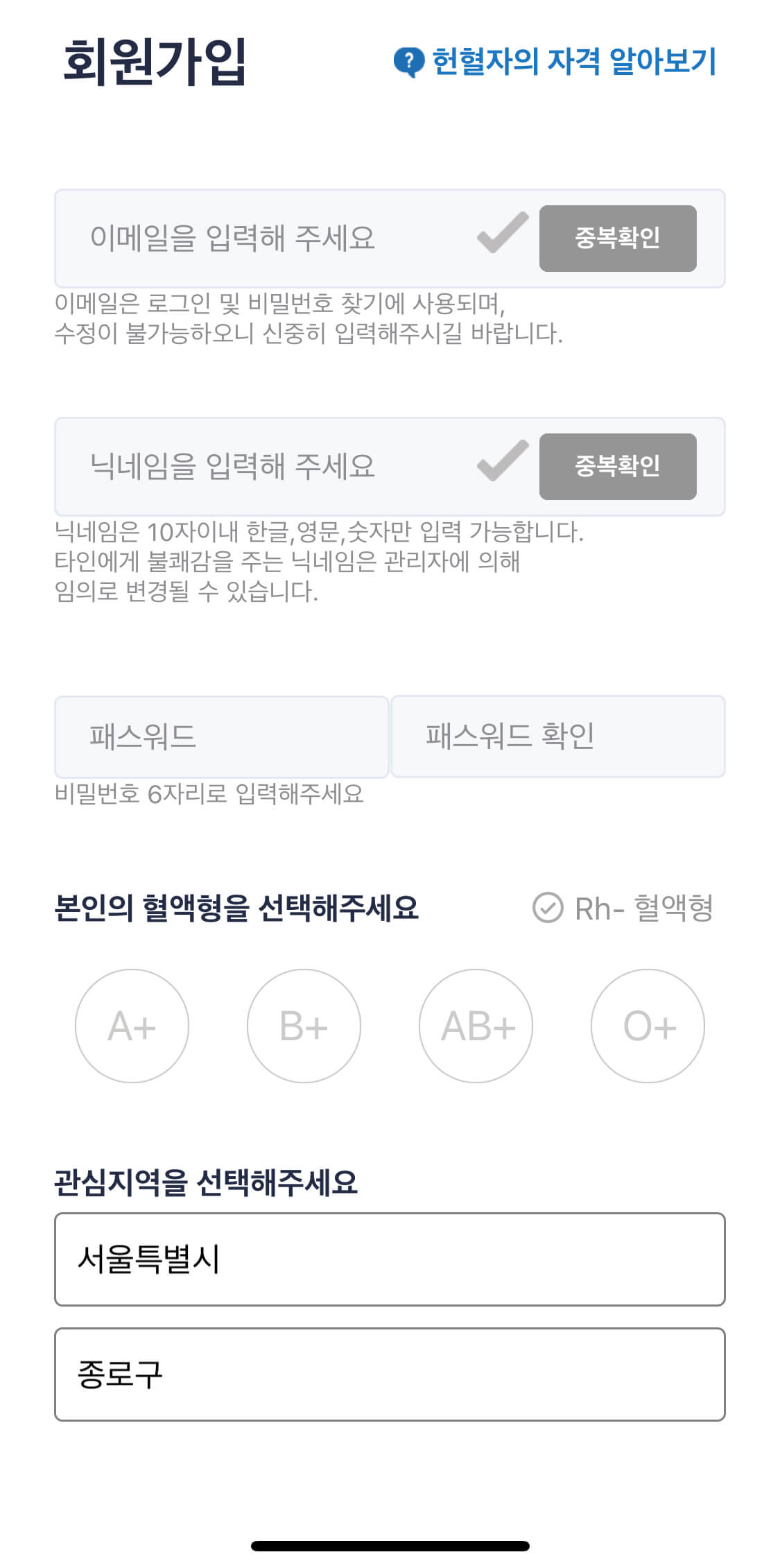 회원가입은 이메일주소, 닉네임, 비밀번호 본인혈액형 관심지역만 설정하면 가입완료됩니다.