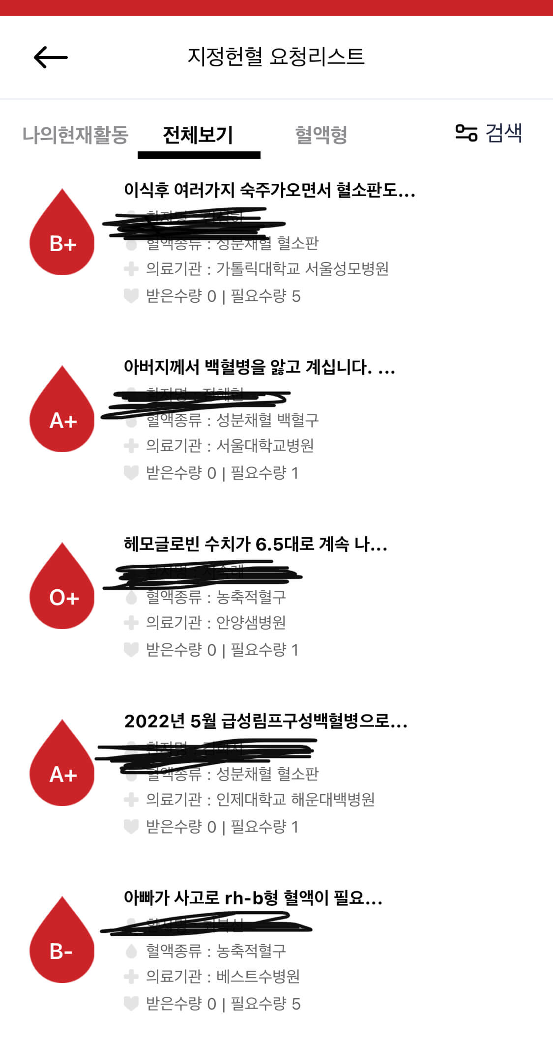 필요한 사람들에게 많은 도움이 될 것같고 이왕 헌혈하러 간다면 필요로 하는 사람에게 줄 수 있다는 점이 좋은 것 같습니다. 지정헌혈을 요청하던가 요청리스트 전제보기는 모든 혈액의 요청리스트를 확인할 수 있으며, 혈액형을 터치하면 가입 시 입력한 나의 혈액형에 대한 요청리스트만 확인가능합니다.